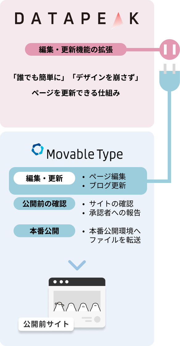 Movable Type は、ウェブサイトの構築を効率化し、エンジニアやWeb デザイナーではなくともコンテンツの作成を容易に行えるようにするCMS(Content Management System)です。