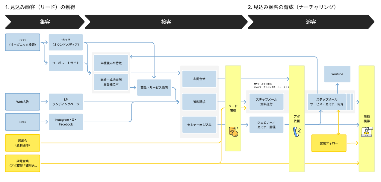 - そのプロセスを、「集客」「接客」「追客」に分けて可視化します。